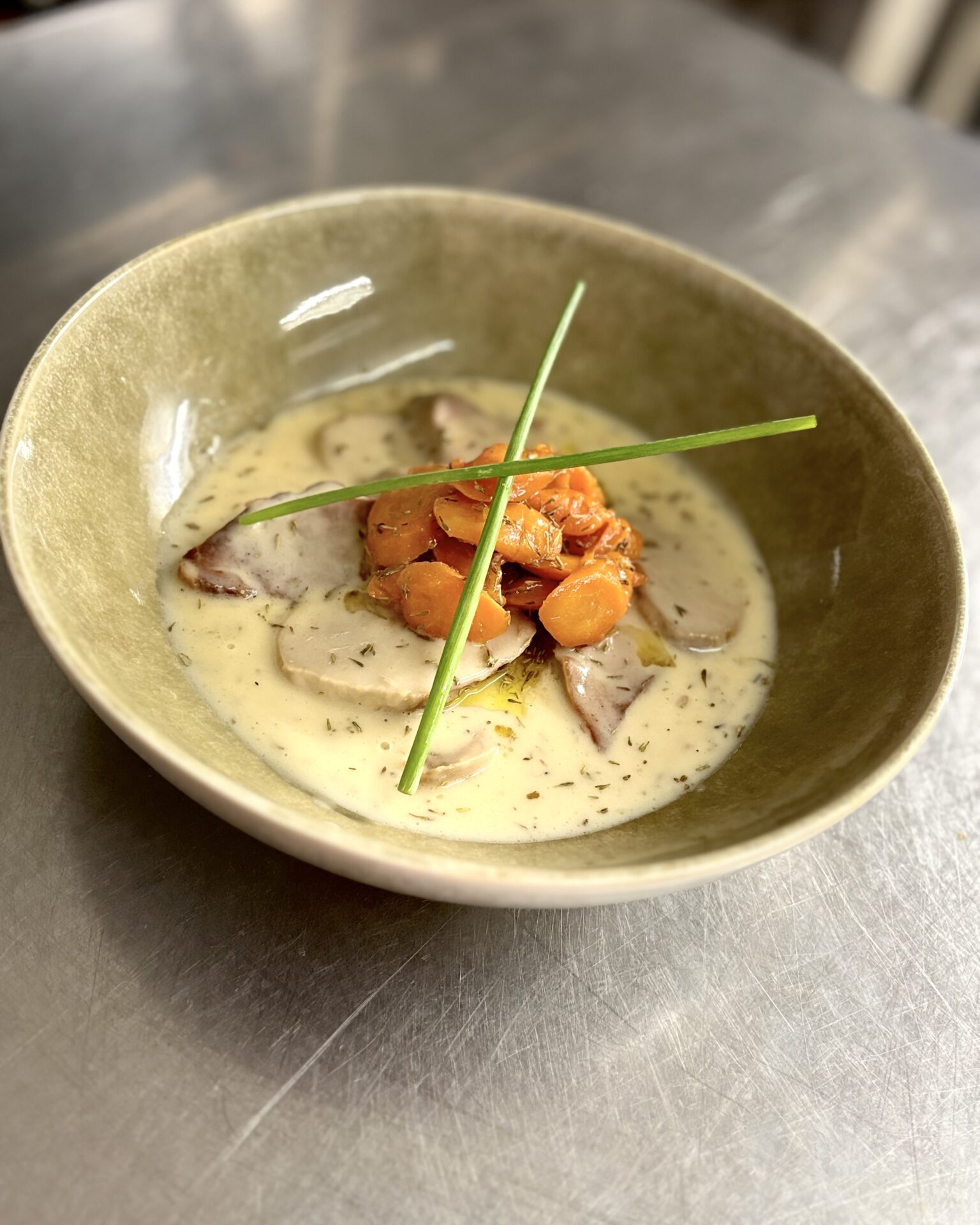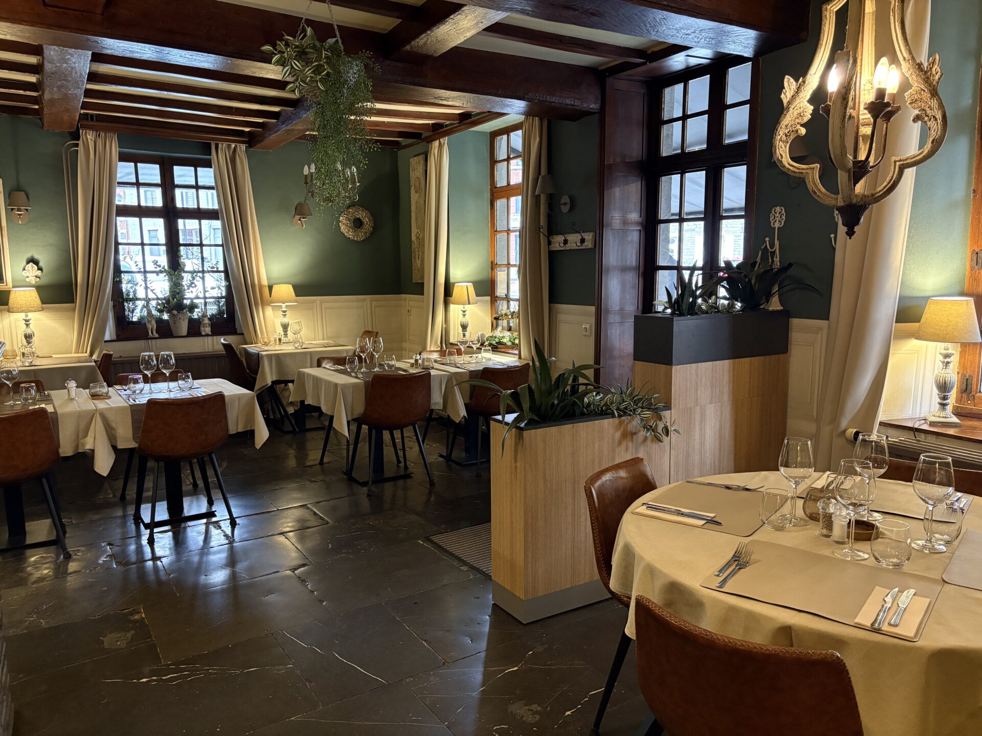 En cuisine, la patronne perpétue une tradition gourmande assumée : une cuisine « à l’ancienne », généreuse et mijotée, qui met à l’honneur les grands classiques du terroir belge. Fricassée de langue d’agneau, filet pur de porc au thym et au miel, ragoût de marcassin, duo de gibier ou encore escavèche artisanale font partie de ces plats signature qui racontent la région dans l’assiette. Les recettes sont élaborées à partir de produits frais, majoritairement locaux, avec une attention particulière portée à la qualité et à la saisonnalité.